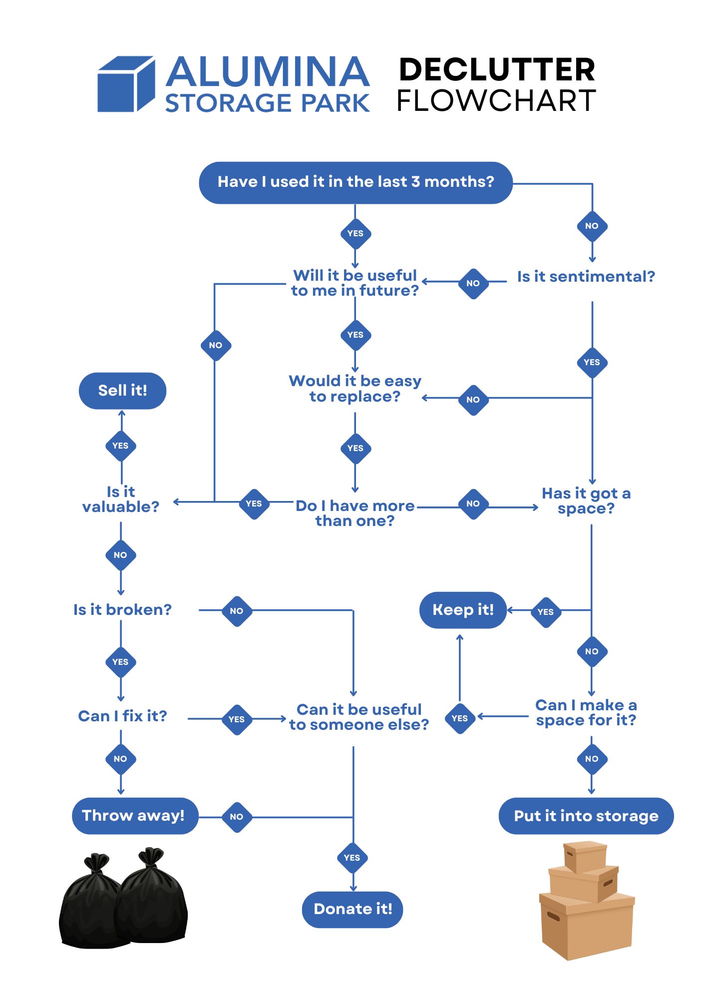 Feeling overwhelmed by clutter? We've created something that might help - Our Decluttering Flowchart is here to guide you through the process! Whether it’s your home or office, we’ve made it easy to ask the right questions and make the best choices. Don’t let clutter slow you down—find out what to keep, what to store, and what to let go of, so you don’t end up just shifting the mess into storage, but rather store only what truly matters!